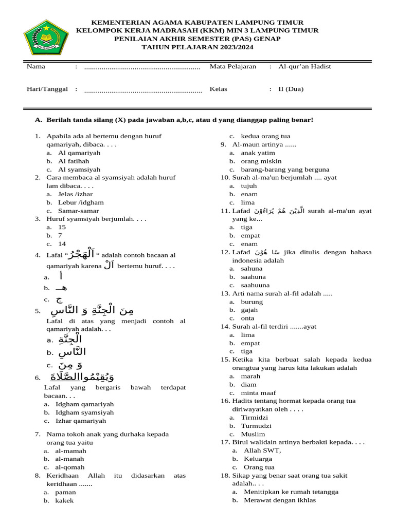 - Mengukur Tingkat Pemahaman: Soal-soal yang dirancang dengan baik dapat menunjukkan sejauh mana siswa memahami konsep-konsep dasar Al-Qur’an dan Hadits yang telah diajarkan. Apakah mereka mampu mengidentifikasi makna ayat, menghafal surat pendek, atau memahami arti hadits sederhana?